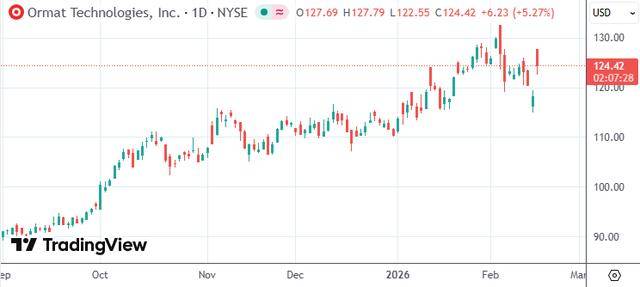 受消息提振,奥玛特科技(股票代码:ORA)股价早盘一度涨7.67%报134.48美元,现涨幅收窄至5.3%附近,报124.41美元。
